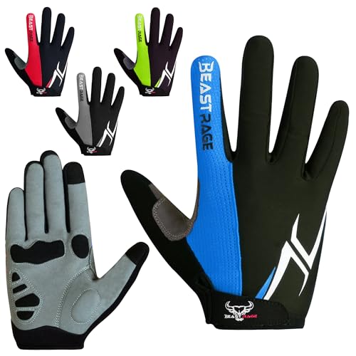 BEAST RAGE Fahrradhandschuhe, halber Finger, für Damen und Herren, mit Gel, gepolstert, rutschfest, stoßabsorbierend, für Fitnessstudio und Mountainbike, atmungsaktiv (blauer Finger, Größe L)
