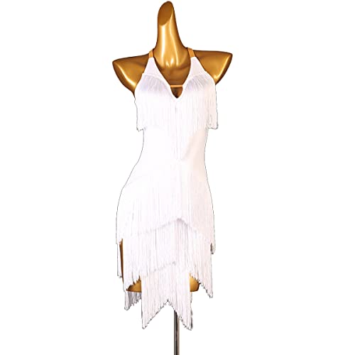 kzytamz Breiter Sling für Damen mit V-Ausschnitt Latein-Tanzkleider Ballsaal Salsa Samba-Kostüm Latein-Wettbewerbskleid Latein-Trainingskleid Für Frauen Flamenco Kleid (XL,White)